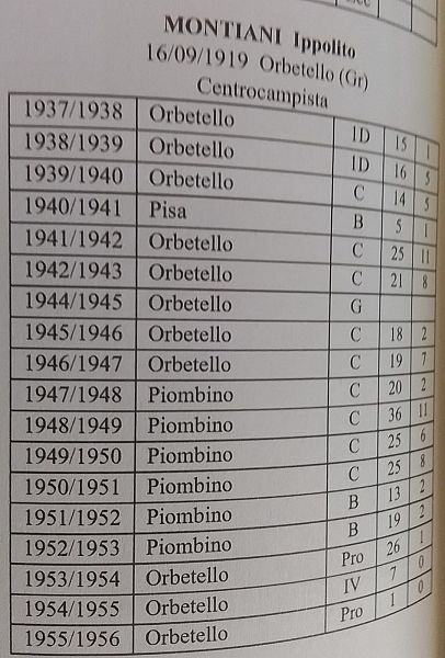 . — Uno degli eroi del magico Piombino che per tre anni ha disputato il Campionato Nazionale di Serie B è Ippolito Montiani, orbetellano del 1919 che gioca in Prima Divisione dal 1937 al 1939 con la squadra lagunare. Promosso in C nel 1939/40 con i colori bianco celesti, a vent’anni va in cerca di fortuna al Pisa in B, gioca poco, quindi rientra nella sua Orbetello in C, dal 1941 al 1947.