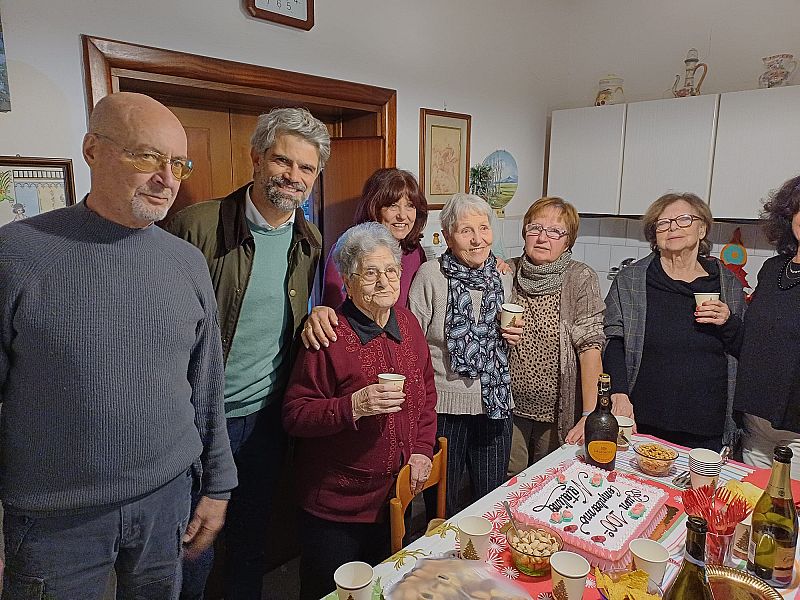 Natalina Caldari, vedova Ferri, ha compiuto 100 anni il 25 Dicembre 2025. Oggi la festa con il sindaco Ferrari, la Pubblica Assistenza e i nipoti