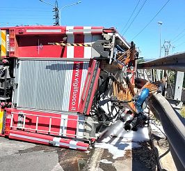 PIOMBINO — Paura a Piombino nel primo pomeriggio di oggi, 25 Aprile, verso le 14, dove un camion dei vigili del fuoco si è ribaltato finendo appoggiato su un fianco sulla strada provinciale, all'altezza delle rotatoria che va in località Cotone.