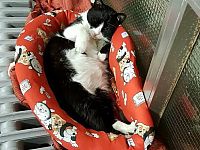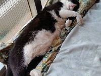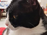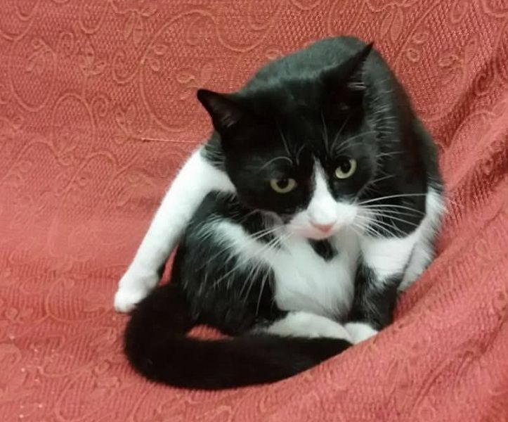 Il gatto è nero a chiazze bianche come si vede dalle foto.