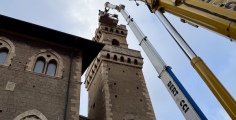 L'intervento nell'ambito delle operazioni di manutenzione della torre campanaria del Palazzo Comunale